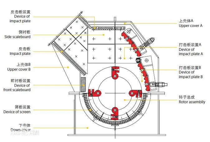 Структура је једноставна и састоји се од кућишта, ротора и ударне плоче. Главни радни део ударног дрокру је брза ротирајућа ротор са камионом са плочама. Током поступка удара за узврати, материјални блокови се такође сударају једни са другима. Пошто је материјал погођен чекићем за плочу, утицај ударне плоче и сударање међусобно, пукотине и лабављење непрестано се ствара унутра, што на крају доводи до дробљења. Утицајни уређај се користи за подношење материјала који је погодио чекић са плочом и одбијен је. Главна компонента је ударна плоча, која је заварена челичним плочама. На њеној површини отпорне на хабање на њеној ударној површини, а неке употребе ударних барова или плоча за решетке.